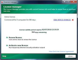 Kaspersky kini hadir dengan ersi terbarunya yaitu Kaspersky Anti Virus 2010 dan Kaspersky Internet Security 2010 . Kaspersky sebagai salah satu Program Anti Virus kini makin meyakinkan dan terkenal ketangguhannya untuk melindungi komputer kita.Pada postingan ini saya akan memberikan anda Kaspersky Anti Virus 2010 v.9.0.0.736 Final lengkap dengan key file yang di situs resminya dihargai beberapa puluh dollar. Dengan Kaspersky Anti Virus 2010 maka komputer kita akan aman dari ancaman virus, trojan, malware, adware dan file-file berbahaya lainnya.